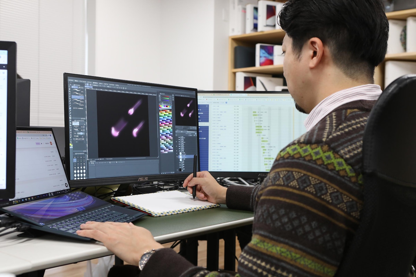 仕事としてはプロジェクトマネジメントをベースにアートディレクションを行い、手を動かす仕事としてはゲームエフェクトの素材作成をしています。使用ソフトは「CLIP STUDIO PAINT」や「Adobe After Effects」等。