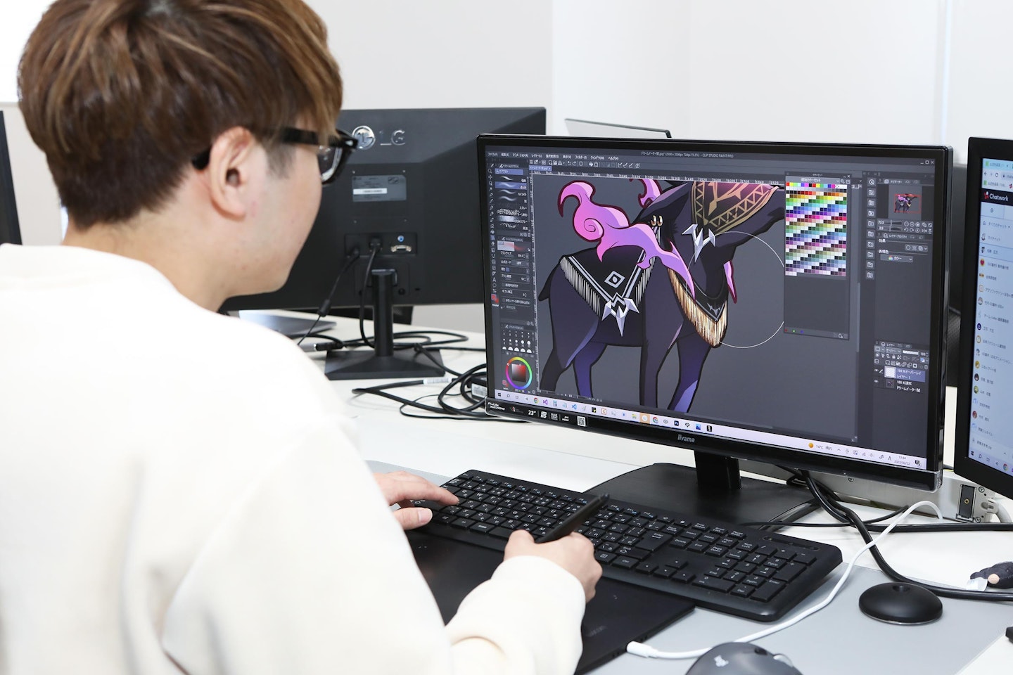 自分の作業の合間にアルバイトのイラストチェックや先方の対応を行っています。